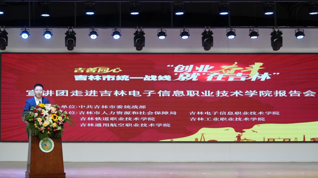 5月16日,吉林市统一战线“创业奋斗 ‘就’在吉林”宣讲团走进我校,举办报告会及就业招聘会。省委统战部副部长李明智,市委常委、宣传部部长、统战部部长王卫东,市政府副市长王石红,吉林铁道职业技术学院党委书记陈煜平、吉林工业职业技术学院党委副书记兼院长陈厚合、吉林通用航空职业技术学院党委书记王洪福,欧美日本国产一区二区三区在线看党委书记何晓杰等领导出席活动。报告会由市委统战部副部长曲洪利主持。