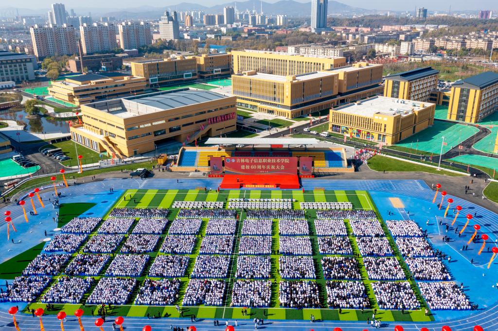 建校60周年庆祝大会现场吉林省委教育工委副书记、省教育厅党组书记、厅长张洪彬,吉林市委副书记、市长王吉,省总工会党组书记、副主席隋明利,省人社厅副厅长杨如军,省工信厅副厅长张春宇;吉林省人社厅、财政厅,吉林市、龙潭区部分局机关领导;省内外54所高校领导,139家合作单位领导,部分学校老领导,中共吉林省委政法委原副书记姜德志、美乐家(中国)执行总监刘保国、中国黄金集团夹皮沟矿业有限公司党委书记吴枝亮等400余名校友代表出席大会。